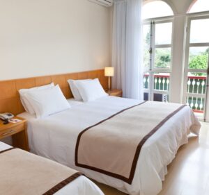 Quartos charmosos com camas aconchegantes. Contam com Ar climatizado, Smart TV 43”, frigobar, telefone, cofre e secador de cabelo.